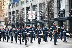 In addition to the mandatory weekly training syllabus, there are additional regularly scheduled activities that cadets can participate in optional training that includes band, firearms safety and marksmanship using the 10 metre air rifle for both training and competition, biathlon, military drill practice, first aid training, and competitions,[20] and ground school instruction in preparation for glider pilot and private pilot training courses. Many of these activities also involve regional, provincial, or national competitions between teams and individual cadets. Throughout the year there are weekend exercises organized by the local squadrons. Survival exercises, participation in Remembrance Day ceremonies, and familiarization flights, are all activities in which cadets may participate at various points throughout the training year. Some cadet squadrons participate in community events such as parades and band concerts.[21]