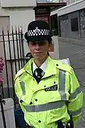 In general the uniformed officers of the Gibraltar force follow British police models in their dress. On foot patrol, male constables and sergeants, like their counterparts in England and Wales, Jersey, Guernsey, the Isle of Man and Bermuda, wear the traditional headgear of the "bobby on the beat", correctly known as the "custodian helmet", which is similar to some Army helmets and was adopted by the Metropolitan Police in London in 1863 to replace the top hat formerly worn, other forces then following suit. The helmet is traditionally made of cork covered outside by felt or serge-like material that matches the tunic.