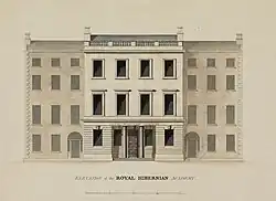 The RHA was founded as the result of 30 Irish artists petitioning the government for a charter of incorporation. According to the letters patent of 5 August 1823, The Royal Hibernian Academy of Painting, Sculpture, and Architecture was established, which included a National School of Art.[3] The first elected president was the landscape painter, William Ashford. In 1824 architect Francis Johnston was made president. He had provided headquarters for the RHA at Academy House in Lower Abbey Street at his own expense.[4] The first exhibitions took place in May 1825 and were held annually from then on. To encourage interest in the arts, works displayed at the RHA were distributed by lot as prizes among subscribers. Works by Frederick William Burton, Daniel Maclise, J. M. W. Turner and David Wilkie, among others, were presented in this way.[5] The exhibitions and school prospered and by the end of the 19th century the RHA was the leading Irish institution involved in promoting visual arts.