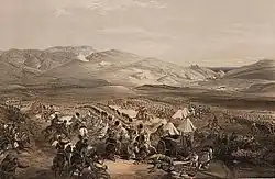 By 12 September 1882, Wolseley was prepared enough to plan an attack on the strongly fortified Tel-el-Kebir.[60] He had 30,000 Sudanese and Egyptians, and 70 guns. Wolseley planned a surprise night march, and a dawn raid. On the 13th at 5 am they attacked with the Household cavalry on the right rolling up the flank, causing panic in the Egyptian ranks. They rode 60 miles in 24 hours, reaching Cairo the following day. On 20 October The Blues landed on board the Lydian Monarch to a triumphal reception at Southampton. They processed amidst cheering crowds towards Regent's Park Barracks. The Queen was relieved Prince Arthur, Duke of Connaught and Strathearn had returned.[61] Both Victoria and the Prince of Wales, who was temporarily staying at Bad Homburg wrote the regiments with congratulations[62] On 21 October Cambridge went to Regent's Park Barracks to inspect the Squadron of the Blues. The men looked thin but in perfect health, and for the horses, though ragged, looked quite fit for work, and better than I expected".[63] And on 25 October they were entertained to a banquet at the old Holborn Town Hall, while they stayed at Knightsbridge Barracks.[64]