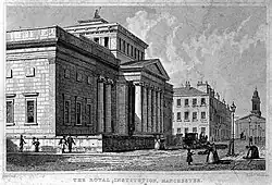 The Institution was housed in a building in Mosley Street designed by Charles Barry in 1824. Construction of the building began in 1825, and was completed in 1835, at a cost of £30,000. A Grade I listed building, it is his only public building in the Greek neo-classical style.[1] The Institution held regular art exhibitions, collected works of fine art and promoted the arts generally from the 1820s until 1882, when the building and its collections were transferred under Act of Parliament to Manchester Corporation, becoming Manchester Art Gallery.