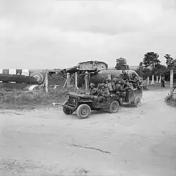 Riflemen of the Royal Ulster Rifles, 6 Airlanding Brigade, aboard a jeep and trailer, driving off Landing Zone N past a crashed Airspeed Horsa glider on the evening of 6 June 1944.