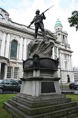 The regiment suffered serious losses at the Battle of Stormberg in December 1899 during the Second Boer War.[7] In October 1905, a memorial was erected in the grounds of Belfast City Hall in memory of the 132 who did not return. Field Marshal Lord Grenfell unveiled the memorial while the Times reported the event.[8]