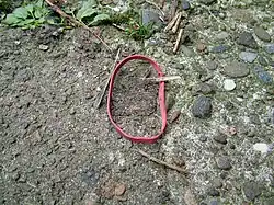 A Royal Mail rubber band is a small red elastic loop used by the postal delivery service in the United Kingdom. In the course of its work, the Royal Mail consumes nearly one billion rubber bands per year to tie together bundles of letters at sorting offices.[1] In the 2000s, complaints about Royal Mail rubber bands littering the streets of Britain gave rise to ongoing press interest in this minor cultural phenomenon.