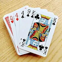 Royal Marriage is a patience or solitaire game using a deck of 52 playing cards.[1] It is an eliminator game in the style of the solitaire game Accordion. The game is so called because the player seems to remove anything that comes between the Queen and the King of the same suit for them to "marry." It also goes under the name Royal Wedding[2] or Matrimony.[3]