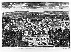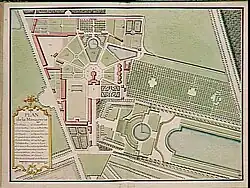 It is centred around an octagonal building covered by a slate dome.[4] This building is surrounded by an octagonal courtyard opening onto seven courtyards separated by gates and walls for birds and exotic animals. A balcony surrounds the first floor of the building, providing a view of the various fan-shaped enclosures.[4] At the front of the building is a courtyard of honor. Regarding the general layout of the menagerie and animal courtyards, Louis Le Vau was inspired by the aviary of the Roman patrician Priscus at Casinum, which he probably knew from an engraving by Pirro Ligorio. This gave rise to the idea of a castle opening onto a pavilion whose shape was reproduced by the surrounding enclosures.[5]