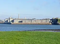 The Royal William Victualling Yard is arranged around a deep basin lined with granite (designed to accommodate half a dozen 'transports' or merchant vessels).[2] This basin provided the main point of access from the sea, although a double set of steps rising from a landing-stage below the Clarence Building provided a fitting entrance for dignitaries arriving by boat. A tunnel entrance was also provided, giving access from Firestone Bay (on the opposite side of the promontory), where boats could be landed in the event of vessels being prevented (e.g. by a strong tide or adverse weather) from reaching the basin.[2] The main access from land was (and is) through a grand gateway at the end of Cremyll Street, a high wall having been built around the landward portion of the site for its security. A reservoir to the south provided the Yard with an independent supply of fresh water.[7]