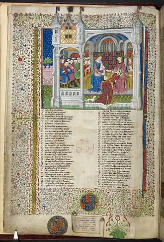 Despite the cultured nature of his court, and his encouragement of English poets, little is known of the royal books under Richard II, although one illuminated manuscript created in Paris for Charles VI of France to present to Richard, the Epistre au roi Richart of Philippe de Mézières (Royal 20. B. VI), was at Richmond in 1535, and is in the British Library Royal manuscripts.[9] The reign of Henry IV has left records of the building of a novum studium ("new study") at Eltham Palace finely decorated with more than 78 square feet of stained glass, at a cost of £13, and a prosecution involving nine missing royal books, including bibles in Latin and English, valued respectively at £10 and £5, the high figures suggesting they were illuminated.[10] The wills of Henry's son, Henry V refer to a Biblia Magna ("Big" or "Great Bible"), which had belonged to Henry IV and was to be left to the nuns of Henry V's foundation at Syon. This may be Royal MS 1. E. IX, with fine historiated initials illuminated in London by several artists from the school of Herman Scheerre of Cologne.[11] A considerable number of religious texts were left to family members, staff and his many chaplains.[12]