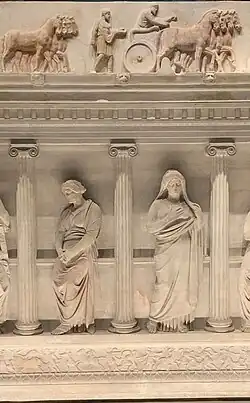 Hellenic style sarcophagus, shaped like an Ionic temple and made of Pentelic marble with polychrome reliefs.[66] The trough stands on a 0.4 m (1.3 ft) pedestal consisting, from bottom to top, of a flat band, a row of egg-and-dart motifs framing an intricate relief depicting a hunting scene, a molding and a final flat band that serves as a plinth. On top of the plinth, a row of 14 Ionic columns and four pilasters enshrine 18 female figures in mourning.[67] The columns are surmounted by an architrave. The trough measures 2.68 m × 1.38 m (8.8 ft × 4.5 ft) and 1.29 m (4.2 ft) high.[67]