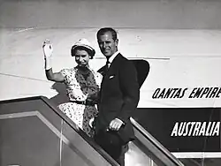 After several days of engagements in the city of Brisbane, Queen Elizabeth II and The Duke of Edinburgh commenced their regional tour flying to Longreach on Wednesday 15 April. The primary purpose for their stopover in Longreach was to visit the first operational base of Queensland's first airline which became Australia's overseas airline. During the visit they viewed an exhibition of Qantas memorabilia, including a replica of the company's first aircraft, the AVRO 504K of 1921. The occasion marked the 50th anniversary of the founding of Qantas.[33]