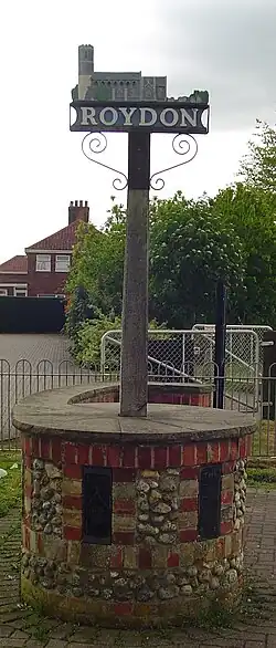 Roydon is a small village, parish and electoral ward in the county of Norfolk, England, about a mile west of Diss. It covers an area of 5.54 km2 (2.14 sq mi) and had a population of 2,358 in 981 households at the 2001 census,[1] the population of both parish and ward increasing to 2,457 at the 2011 Census.[2]