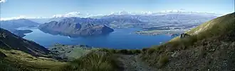 Roys Peak is a mountain in New Zealand,[1] standing between Wānaka and Glendhu Bay. It offers a full-day's walk with views across Lake Wānaka and up to the peak of Mount Aspiring / Tititea. The track zigzags steeply up the side of Mount Roy through thick grass until the ridge to the summit. The peak was named in honour of the Scottish hero Rob Roy MacGregor by early settlers.