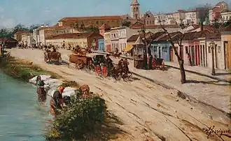 Much of the area that is Rua 25 de Março today was originally part of the Tamanduateí River. A series of river engineering projects in the late nineteenth and earlier twentieth centuries realigned the Tamanduateí and Anhangabaú rivers, moving the river and the port further to the east. The old port, Porto Geral, lends its name to one of the major cross streets of 25 de Março, Ladeira Porto Geral. The original street name, "Rua de Baixo", refers to the low (baixo) position of the land in comparison with the streets uphill to the west. In 1865 the name change was changed to commemorate the date of Brazil's first constitution, signed on 25 March 1824.[1]