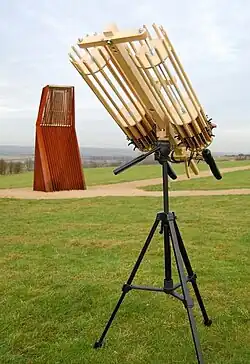 They are usually made of wood (although many Lego-based designs have been produced), and most have a strong machined plastic firing mechanism, consisting of a rotor where bands are hooked, and an escapement mechanism that lets the rotor rotate one position, releasing a rubber band. In Lego designs, a gear is commonly used in place of a conventional rotor, and due to how fine the teeth on the gear are, the escapement allows a rotation of more than one tooth, requiring rubber bands to be loaded a set number of teeth apart.
