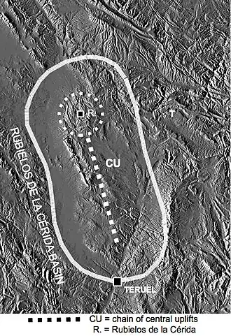 The c. 80 km x 40 km sized Rubielos de la Cérida structure is a claimed impact feature located in Aragon, northeast Spain, north of Teruel purported to have formed during the Upper Eocene or Oligocene (roughly 30 - 40 Mill. years ago). The name is derived from the nearby village of Rubielos de la Cérida. The claim that the structure represents an impact feature is rejected by the majority of scientists, and the mainstream consensus is that the supposed structure is explained by non-impact related tectonic structures, namely the Jiloca-Calatayud graben and the Alfambra-Teruel graben.[1]