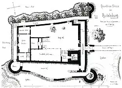 The Rudelsburg was constructed in the Middle Ages with a central ward divided into several sections and surrounded by an outer ward. The stones of the outer ward were largely reused in the 18th century and it is no longer recognisable; only parts of the wall in the east and south are still there. The outer ward was unusual to the extent that it was built higher up than the central ward was.
