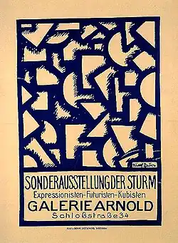 Bauer supported himself as an artist by creating illustrations and caricatures for some of the major magazines and newspapers of the day.[1] In 1912, as Bauer continued to do figurative and commercial work, he began working in an abstract mode. That same year he met Herwarth Walden, who had just founded the magazine Der Sturm and the affiliated gallery. Der Sturm would become the most important artistic center in Berlin at this period. In 1915 Bauer was invited to participate in a group show at Der Sturm. He would continue to actively participate in the Der Sturm gallery scene through the mid-1920s. He had his first solo show there in 1917, with 120 "Lyrical Abstract" works, with solo shows in 1919 and 1920. Among the artists who were in the Der Sturm group were Wassily Kandinsky, Marc Chagall, Paul Klee, and Franz Marc. Like Paul Klee, Bauer became a teacher in the Sturm School.
