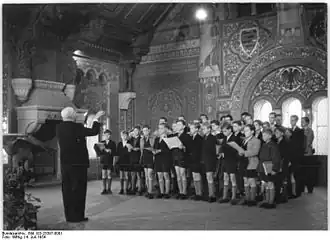 After positions in Aachen and Eisenach, he became director of the renowned Dresdner Kreuzchor in 1930, a position he held until his death. In May 1933, Mauersberger became a member of the Nazi Party;[1] there are strong indications though that he tried to minimize the influence of the NS-Ideology and in particular of the Hitler-Jugend onto the choir. He refused to stage NS-songs with the choir,[2] and continued to perform the works of banned composers such as Felix Mendelssohn Bartholdy and Günter Raphael, at least as late as 1938.