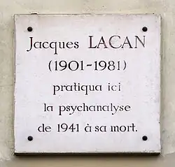 - No. 5: psychoanalyst Jacques Lacan had his practice in this building;[12] a commemorative plaque pays tribute to him. Philippe Sollers writes: “I go to 5, rue de Lille and I come across the address of Lacan, who, as we know, practiced his very trying profession of psychoanalyst there from 1940 until his death (in 1981). If Lacan's couch could talk, it would put the entire novel industry in crisis, with its millions of books written for nothing. This address is familiar to me. Although I never lay down at his place, it's where I used to pick him up on certain evenings, to dine in his company at La Calèche, the restaurant across the street. The 5 was a promise of pleasure. But 5, rue de Lille (and this is where time begins to speak in hushed tones) was also the address of a certain Darasse, banker to Isidore Ducasse, comte de Lautréamont, when he came to collect the pension his father sent him from Montevideo (Darasse was in business with that distant country). [...] It was to the same banker, Darasse, that Ducasse, on March 12, 1870 (he died in November, aged 24 and a half, during the German siege of Paris), announced that his method had completely changed after the failure of Les Chants de Maldoror and that in Poésies I and II, therefore) he would sing exclusively of “hope, expectation, calm, happiness, duty”.”[13][14]