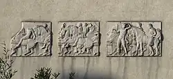 Loos was very adamant about the pure form of the cube above all and decoration is kept to a bare minimum. The walls are a stark white and the window frames contain the least amount of structure. This, however, is balanced by the frieze and cornice that runs along the top of the building, and a replica of some portions of the Parthenon frieze positioned on the street side low enough for viewing. The frieze and cornice tie together the entire building while still contributing to the austere nature and seeming almost invisible. The Parthenon replications are seen to balance out the voids and surfaces on the building (windows and walls) while at the same time balancing the purist abstraction of the ideal cube form. The panels tie in the history of Western architecture and seem to project the idea that Adolf Loos was a classical architect & not a radical.