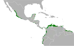The rufous-necked wood rail is found in Mexico on the Pacific coast and the coast of the Yucatán Peninsula and generally (though discontinuously) along both the Pacific and Caribbean coasts of Central America. In South America it is found along the Pacific coast discontinuously from Colombia through Ecuador to northern Peru, along the Caribbean coast from Colombia through Venezuela and the Guianas, and on Trinidad.[6] In addition, a vagrant spent much of July 2013 at Bosque del Apache National Wildlife Refuge in New Mexico. Many bird enthusiasts and watchers traveled to the state to view it.[7]