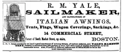In 1852, he put up the first Italian awnings in Boston, sold to commission merchant James W. Page, who was a trustee of the Thomas–Webster Estate, and friend of Secretary of State Daniel Webster.[4][11] Yale became the leading Boston merchant in sail, awning and tent making in New England.[5][12] He was also a pioneer in the development of the city of Malden, Massachusetts from a small town to a thriving city.[2] He had as customer James Bruce, 8th Earl of Elgin, Governor General of Canada, later Viceroy of India under Queen Victoria, and was in charge of erecting the largest tent in Quebec at the time for the Governor's event.[12][5] His offices were on South Market Street, next to Quincy Market, later at the Fulton-Commercial Streets District.[13]
