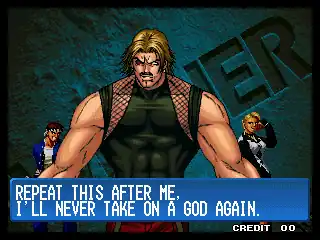 Saisyu Heh, Kyo. My power wasn't so great after all. Kill him, Kyo. Avenge me...!/Kyo: Rugal, you slime!/Rugal: Heh, heh. The defeated dog barks loudest! Taste my fury! Wooooo...