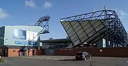Demolition work began at Rugby Park on 8 May 1994, with the stadiums West Stand receiving a major refurbishment including new roofing and floodlights.[18] Both the covered terracing and covered enclosures of the stadium were demolished to make way for the construction of two new stands, the East Stand and the South Stand (the "Moffat Stand"), which were first used on 27 August and 19 November 1994 respectively.[18] The north terracing area had remained in used during construction works, but was demolished in 1995 to allow the construction of the new North Stand (the "Chadwick Stand"), which was first used on 20 April 1995 against Rangers F.C..[18]