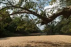 Yala National Park has a variety of ecosystems including moist monsoon forests, dry monsoon forests, semi deciduous forests, thorn forests, grasslands, marshes, marine wetlands, and sandy beaches.[3] The area under forest cover mainly consists of Block I and rangelands of open parkland (pelessa grasslands) including some extensive grasslands. The forest area is restricted to around the Menik River while rangelands are found towards the sea side. Other habitat types of the Block I are tanks and water holes, lagoons and mangroves and chena lands. The mangrove vegetation in the Buthuwa lagoon is largely Rhizophora mucronata while Avicennia spp. and Aegiceras spp. are less abundant. The vegetation of Block II is similar to those of Block I, and Yalawela, once a fertile paddy field, represents pitiya grasslands. The mangroves of Block II occur around the estuary of Menik River, which extend to 100 hectares (0.39 sq mi). The common mangrove plants are Rhizophora mucronata, Sonneratia caseolaris, Avicennia spp., and Aegiceras corniculatum. The lagoons of Pilinnawa, Mahapothana, and Pahalapothana are also located in this block.[3] The other common mangrove species are Acanthus ilicifolius, Excoecaria agallocha, and Lumnitzera racemosa. In the bare sand Crinum zeylanicum is found.[9]