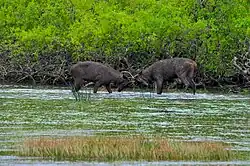 Yala lay in the direct path of the 2004 Indian Ocean tsunami, which impacted Sri Lanka 90 minutes after its generation.[4] The tsunami caused severe but localized damage on the park,[5] with around 250 people being killed.[6] The tsunami wave was reported to be 20 feet (6.1 m) high. The tsunami waves reached inland only through the river-mouth gaps in the coastal dunes.[7] Inundation distances from ranged up to 392 to 1,490 metres (429 to 1,629 yd). The main habitats affected are scrub forest and grasslands. About 5,000 hectares (19 sq mi) of grassland, forest, and wetland were directly affected by the tsunami. The satellite images revealed that mean normalized difference vegetation index (NDVI) range from 0.245 to 0.772 in the Block I and II. After the disaster the NDVI value fell dramatically to 0.2111. Around 60% of the area along the coastline has changed. The damage was worse closer to the sea.[5] The movement patterns of two radio collared elephants were analyzed. The study found out that their movements were consistent with behaviour prompted by immediate cues generated by the tsunami waves rather than a response to a "sixth sense".[8]
