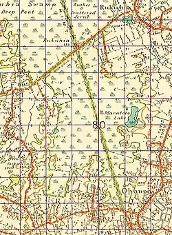 Opening of the line from Hamilton to Ōhaupō was delayed by subsidence at Rukuhia.[8] A service had been planned from 25 February 1878[9] and the Governor General went over the line on 27 March 1878,[10] but opening was still postponed[11] as large quantities of gravel were poured into a hole.[12] The line finally opened on 4 June 1878.[13] The station was surrounded by peat fires in 1935.[14] A 1943 notice noted that owing to the danger of track subsidence, no engine must be allowed to remain stationary on the siding for any length of time.[15] Tests in 1981 found that the track deformed by about 12mm each time a train went over it, due to the peat swamp.[16]