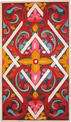 Ninety-four motifs have been observed on rumah gadang. Thirty-seven of them refer to flora, such as kaluak paku ('fern tendrils'), saluak laka ('interwoven rattan'), pucuak rabuang ('bamboo shoots'), areca-nut palms,[1] and lumuik hanyuik ('washed-away moss'). Twenty-eight motifs refer to fauna, such as tupai tatagun ('startled squirrel'), itiak pulang patang ('ducks going home in the afternoon) which symbolizes co-operation and homecoming wanderers,[1] and kumbang janti (golden bumblebee). The remaining twenty-nine motifs refer to humans and sometimes their activities or behavior, such as rajo tigo (three kings of the realm), kambang manih (sweet flower, used to describe an amiable girl) and jalo takambang (casting a net).