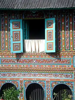 Large communal homes are entered through a doorway in the centre of the structure which is usually surrounded by a perpendicular porch with a triangular gable and upsweeping peaked ridge end. The variation with no entry porch is named bapaserek or surambi papek ("without veranda").