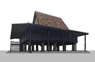 The proper house (dalam) has a square layout.[3] Construction method for the house involves placing a complete frame of the house on top of the posts. The layout is simple, with space divided into two different levels by a 15 centimetres (5.9 in)-high dividing beam (sengkar). The lower area (tempuan), about two-thirds of the total floor area, is where the entrance is located. The lower space is used to prepare and to consume food, with the hearth placed in one corner. In a larger house, the kitchen is located in an additional building known as the beruge. The higher one-third floor area (luan) marks the more private sleeping area. This higher area is also used as the place where elders, or members of the bridge-giving lineage, were seated. The word luan means "stern" of a boat.[2]