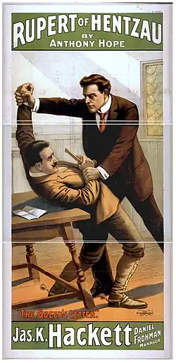 After a successful year on tour, a theatrical adaptation of Rupert of Hentzau opened at the Lyceum Theatre in New York City on April 10, 1899. Written by Anthony Hope with contributions by Edward Everett Rose, the play starred James K. Hackett in the dual roles of King Rudolf and Rudolf Rassendyll.[2][3]
