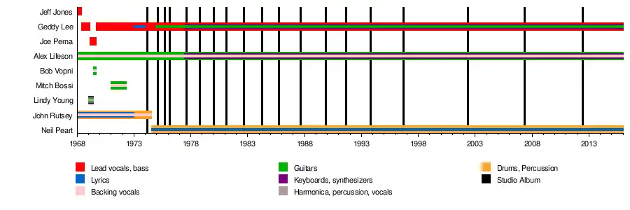Rush was a Canadian rock band formed in Toronto in 1968 that consisted primarily of Geddy Lee (vocals, bass, keyboards), Alex Lifeson (guitars) and Neil Peart (drums, percussion). The band's original line-up consisted of Lifeson, drummer John Rutsey, and bassist and vocalist Jeff Jones, whom Lee immediately replaced. After Lee joined, the band went through a few line-up changes before arriving at its classic power trio line-up with the addition of Peart in July 1974, who replaced Rutsey four months after the release of their self-titled debut album; this line-up remained unchanged for the remainder of the band's career.