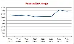 The first recorded population statistic was in the 1881 census. At that time the population was 334. Since then that number has fluctuated, but on the whole has increased. An example of this fluctuation is in 1911 where the population was 305. After that it increased up to 415 in 1951. Today the figure stands at 484.[6]