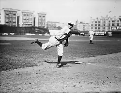 New York attempted to cut Ford's salary before the 1914 season,[2] so he jumped to the Buffalo Buffeds of the outlaw Federal League.[25] He had a 21–6 win–loss record for Buffalo in 1914 with 123 strikeouts; his .778 winning percentage was the best in the Federal League that year, and his 1.82 ERA was the second-best, behind Claude Hendrix.[17][26][27] He was reported to be using a knuckleball during the 1914 season.[28]