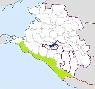 Russian Black Sea coast (Russian: Черноморское побережье России) also rarely Circassian coast (Adyghe: Адыгэ хы аушу, Adyge xy aušu; Russian: Черкесское побережье, Čerkesskoe poberž′e) was the coast of historical Circassia on the Black Sea before 1864, extending from Anapa in the north to Adler in the south, and including cities like Tuapse and Sochi.