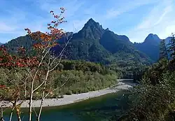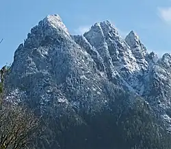 The history of the formation of the Cascade Mountains dates back millions of years ago to the late Eocene Epoch.[4] During the Pleistocene period dating back over two million years ago, glaciation advancing and retreating repeatedly scoured the landscape leaving deposits of rock debris.[4] The last glacial retreat in the area began about 14,000 years ago and was north of the Canada–US border by 10,000 years ago.[4] The U-shaped cross section of the river valleys is a result of that recent glaciation. Uplift and faulting in combination with glaciation have been the dominant processes which have created the tall peaks and deep valleys of the Cascade Range.