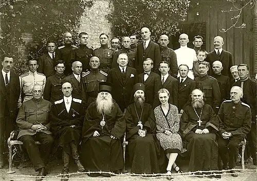 After the deaths of Metropolitan Anthony in August 1936 and Metropolitan Peter of Krutitsy in October 1937 (albeit falsely reported a year prior), the Russian bishops in exile held the Second All-Diaspora Council, first in Belgrade, then in Sremski Karlovci, in August 1938.[19] The council was presided over by Metropolitan Anastasius (Gribanovsky), and was attended by 12 other exiled Russian bishops (at least double the number of Orthodox (Patriarchal) bishops who were allowed to serve within the USSR), 26 priests, and 58 laypersons.[20][21] The Council confirmed the leading role of the Church and its bishops in Russian émigré organizations, and adopted two missives: to Russians in the USSR (Russian: «К Русскому народу в Отечестве страждущему») and to the Russian flock in diaspora (Russian: «К Русской пастве в рассеянии сущей»).[22]