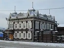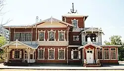Ivan Zabelin, a theorist of the movement, declared that "Russian Khoromy, grown naturally from peasants' log cabins, retained the spirit of beautiful disorder... Beauty of a building is not in its proportions, but on the contrary, in the difference and independence of its parts" ("русские хоромы, выросшие органически из крестьянских клетей, естественно, сохраняли в своем составе облик красивого беспорядка... По понятиям древности первая красота здания заключалась не в соответствии частей, а напротив в их своеобразии, их разновидности и самостоятельности").[4] As a result, "ropetovschina", as Ropet's foes branded his style, concentrated on hoarding together vivid but not matching pieces of vernacular architecture, notably high-pitched roofs, barrel roofs and wood tracery. Wood was the preferred material, since many fantasies could not be physically built in masonry. This was good and bad for "dopetovschina". Bad, because wooden structures, especially those unconventionally shaped, were not scalable and had a very short life span. Very few survive to date. Good, because speed of construction and unorthodox looks were a perfect match for exhibition pavilions, coronation stands and similar short-term projects. The trend continued into 20th century (Fyodor Schechtel)[5] and 1920s (Ilya Golosov).[6]