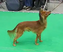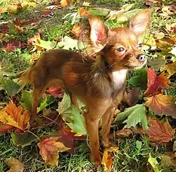 The Russian Toy (also known as the Russian Toy Terrier, and in Russia as the Russkiy Toy, Russian: Русский той) is a very small breed of dog originally bred in Russia from the English Toy Terrier. There are two types of coats in the breed: smooth coat and long coat. The smooth-coated variety was previously known as the Russian Toy Terrier and long-coated as the Moscow Long-Haired Toy Terrier. Both were brought together under the same Russian Toy Terrier name in 1988 and the "Terrier" was dropped from the name when the breed was added in 2006 to the official list of breeds registered with the Fédération Cynologique Internationale.[2] The breed has been registered in the Foundation Stock Service of the American Kennel Club (AKC) since 2008, and has been allowed to compete in AKC companion events since 2010.[2][3] The first official breed standard of the two varieties was written in 1966 in Russia.[2]