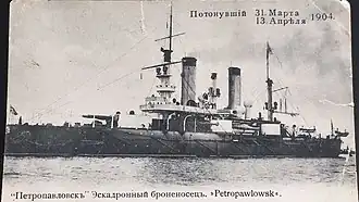 Early on the morning of 13 April, the Russian destroyer Strashnii fell in with four Japanese destroyers in the darkness while on patrol. Once her captain realized his mistake, the Russian ship attempted to escape but failed after a Japanese shell struck one of her torpedoes and caused it to detonate. By this time the armored cruiser Bayan had sortied to provide support, but it was only able to rescue five survivors before a Japanese squadron of protected cruisers attacked. Escorted by three protected cruisers, Makarov led Petropavlovsk and her sister Poltava out to support Bayan, while ordering the rest of the First Pacific Squadron to follow as soon as they could. In the meantime, the Japanese had reported the Russian sortie to Tōgō, who arrived with all six Japanese battleships. Heavily outnumbered, Makarov ordered his ships to retreat and to join the rest of the squadron that was just exiting the harbor.[18] After the squadron had united and turned back towards the enemy, about two nautical miles (3.7 km; 2.3 mi) from the shore, Petropavlovsk struck one or more mines at 09:42 and sank almost instantly,[19] taking with her 27 officers and 652 enlisted men, including Makarov and the war artist Vasily Vereshchagin.[20][21] Seven officers and 73 men were rescued.[8]