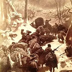 In 1858 the goal was to occupy the Argun River, a north-flowing river 90 km east of the Georgian Military Highway and 35 km west of Veden, thereby cutting off western Chechnya. Unusually for the Caucasus, Shamil never learned of plan. On 15 January 1858 Yevdokimov left Berdikel on the lower Argun. Marching through deep snow he reached Fort Vozdvizhenskoye at the bottom of the first defile.[19] A column marched up the east bank and met valiant resistance, which collapsed when the murids saw an even larger army moving up the opposite bank. The Russians occupied the defile and camped near the modern Dachu-Barzoi where they built Fort Argutinskoye. The axe now replaced the gun. The surrounding auls were burnt, roads and bridges built and trees were cut in all directions. An avenue 1400 yards wide was cut to the crest of the 6000-foot eastern mountain from which one could see Shamil's capital at Veden 10 miles east. Oddly, Shamil remained inactive. Five months later (1 July) the Russians moved on the second 10-mile defile. The murids had fortified it with earthworks and fallen trees. Yevdokimov feinted in that direction and suddenly crossed the river and occupied the western mountain at Lesser Veranda. From there he re-crossed the river to Zonakh, gaining the lower half of the defile. Again they turned to the axe, cutting trees and building roads. On 30 July they broke through south to Greater Veranda, thereby outflanking the defile. They moved down to Shatoy and then north to occupy the second defile. The murids burnt all the auls still in their hands and compelled the inhabitants to retreat with them to Veden. This provoked such anger in the local population that the invader's task became easy. The people of Itum Kale at the head of the third defile revolted and invited the Russians in. Two companies passed the third defile and were hailed as deliverers.[20] The whole Argun was now in Russian hands. Meanwhile, the Russians tried to gather the Ingush around Nazran into a few large settlements. Nazran revolted. Shamil crossed the Argun under Russian fire, could not reach Nazran, and drew back. Six weeks later he tried again with 4000 horsemen. He was defeated, losing 370 dead and 1500 weapons against 16 Russians killed.