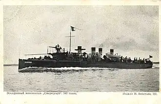 Laid down in 1900[1] in Saint Petersburg, Russia, at the Nevsky Works,[1] Steregushchiy was shipped in pieces to the Imperial Russian Navy base at Port Arthur, China, and assembled there. Launched at Port Arthur in June 1902 with the name Kulik (Кулик, English "Curlew"), she subsequently was renamed Steregushchiy.[1] She entered service at Port Arthur in August 1903.