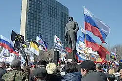 On 6 April 2014, hundreds of masked men stormed and seized weapons from the Security Service buildings in the cities of Donetsk and Luhansk.[59] Protesters then stormed and occupied the Donetsk regional government headquarters, raising the Russian flag and demanding a referendum on joining Russia.[60] The next day, the activists held a meeting in the building and proclaimed the "Donetsk People's Republic" an independent state.[59][61] On 29 April, armed pro-Russian activists stormed and occupied the Luhansk regional government headquarters, proclaiming the "Luhansk People's Republic".[62]