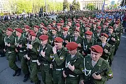 US and international officials continued to report the active presence of Russian military in eastern Ukraine, including in the Debaltseve area.[175] In 2015, Russian separatist forces were estimated to number around 36,000 troops (compared to 34,000 Ukrainian), of whom 8,500–10,000 were Russian soldiers. Additionally, around 1,000 GRU troops were operating in the area.[176] Another 2015 estimate held that Ukrainian forces outnumbered Russian forces 40,000 to 20,000.[177] In 2017, on average one Ukrainian soldier died in combat every three days,[178] with an estimated 6,000 Russian and 40,000 separatist troops in the region.[179][180]