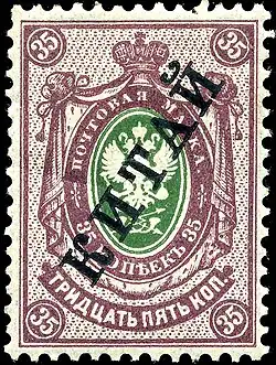 Initially, the offices used the regular stamps of Russia, but in 1899, they received stamps overprinted with "KITAI" (Russian for China) in Cyrillic script. This overprint was applied to all types of stamps up to 1916, including the varieties on horizontally laid, vertically laid, and wove paper. The overprint was also applied to postal stationery envelopes, postcards, letter cards and newspaper wrappers. The overprint itself was in black, blue, or red, generally being chosen to contrast with the stamp colors. Most of these types are commonly available today (less than one US$); the most problematic is the blue overprint on the 14-kopeck wove paper variety, whose existence has been questioned.