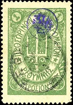 Regularly printed stamps came out later in 1899, printed by Grundman & Stangel of Athens, using a design based on Poseidon's trident. They came in three values, one and two metallik and one grosion (equivalent to four metallik or one piastre), and seven colors (orange, green, yellow, rose, lilac, blue, and black). A third set was issued using a variation of this design, adding five-pointed stars in the frame around the trident, and was printed in blue, rose, green, and lilac.